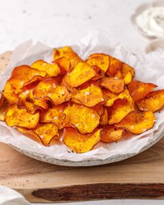 Baked sweet potato chips are rich in fiber and beta-carotene, which has antioxidant properties. Sweet potatoes have a low glycemic index, helping to stabilize blood sugar levels and reduce inflammation.
